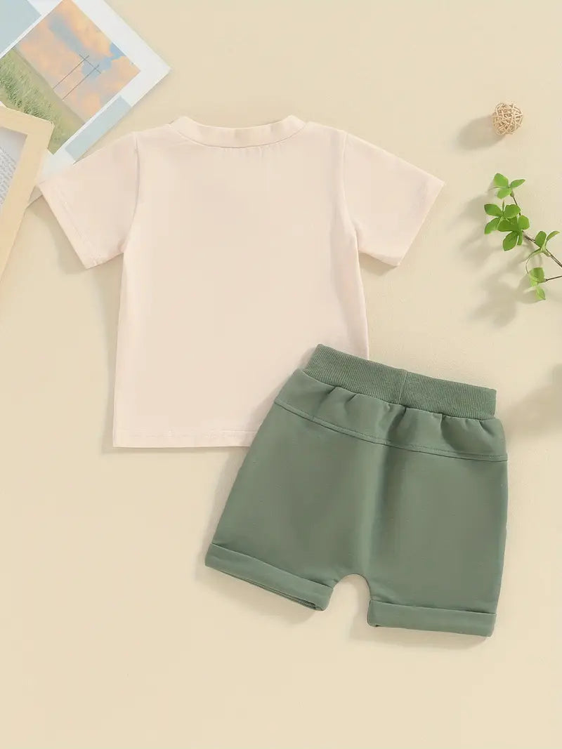 Toddler Baby Boy Summer Outfits Letter Tractor Print Short Sleeve Round Neck T-Shirt with Solid Shorts 2pcs Casual Outfit