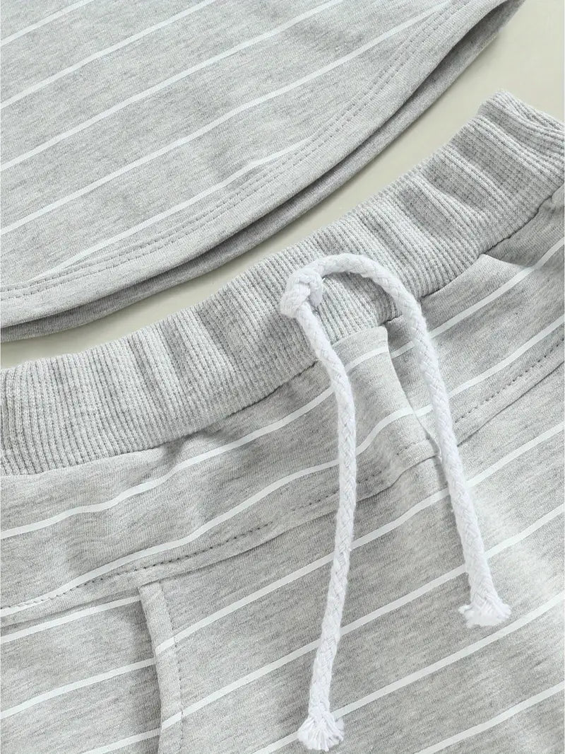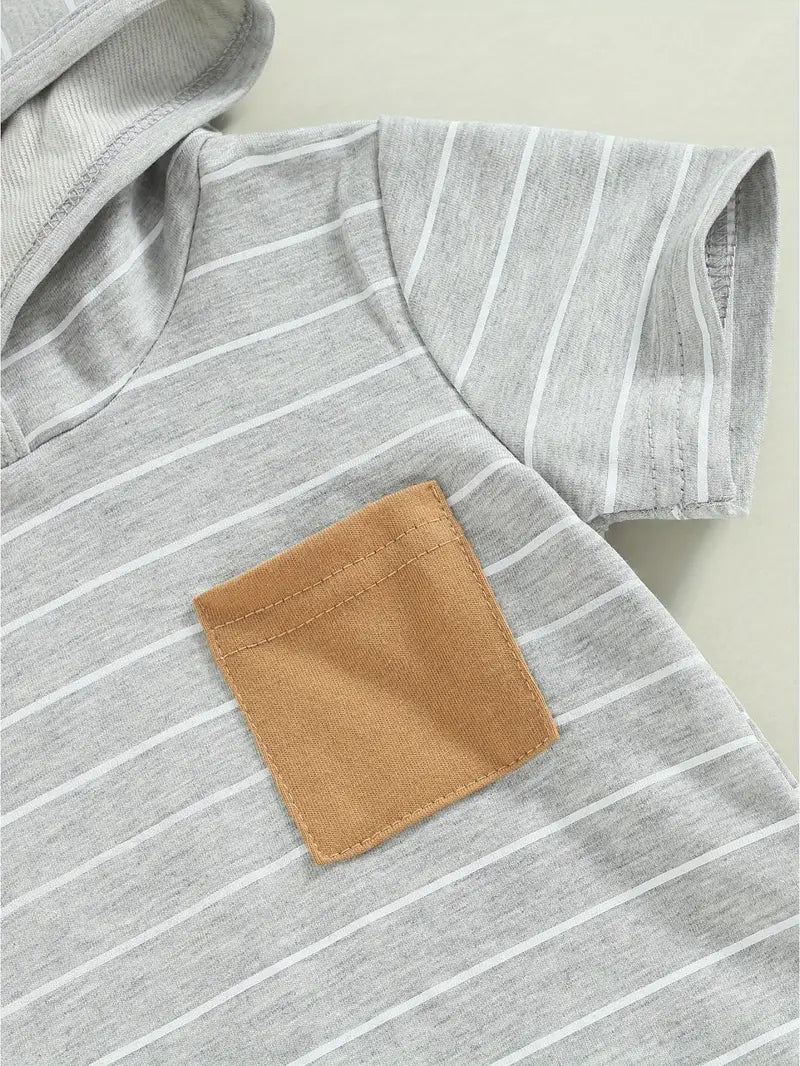 Baby Boys Striped Hooded Sweatshirt and Casual Drawstring Shorts Set, Short Sleeve, Polyester, Spring, Summer or Fall Outfit, Elastic, Perfect for Outdoor. Gray Stripe