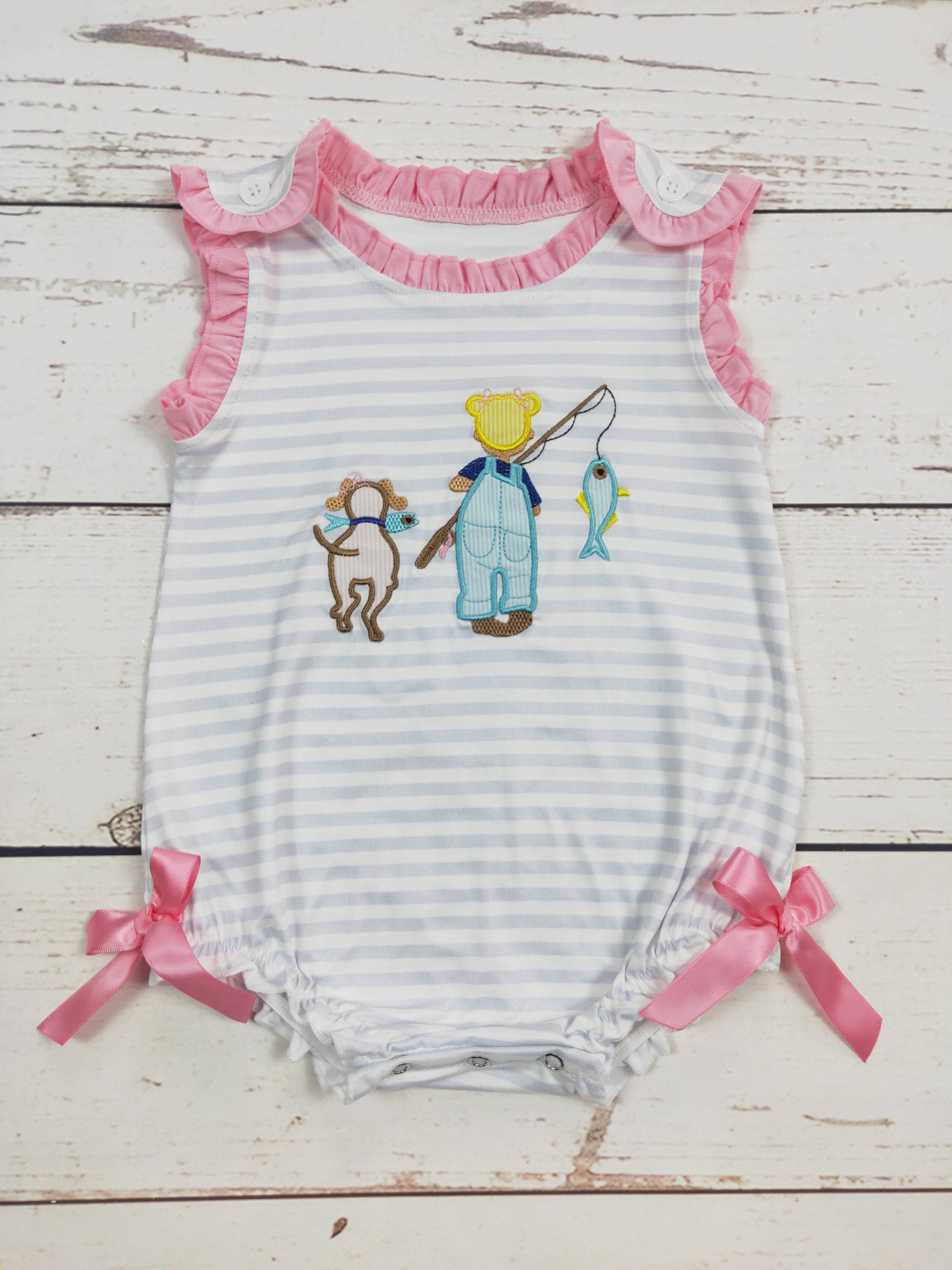 Baby Girl Fishing Lure Appliqué Bubble This adorable bubble outfit features a charming appliqué and is perfect for your little girl's fishing adventures. Made with high-quality fabric, it offers a comfortable and durable option for your little one's wardrobe. Just in time for your next fishing trip. Material is soft polyester