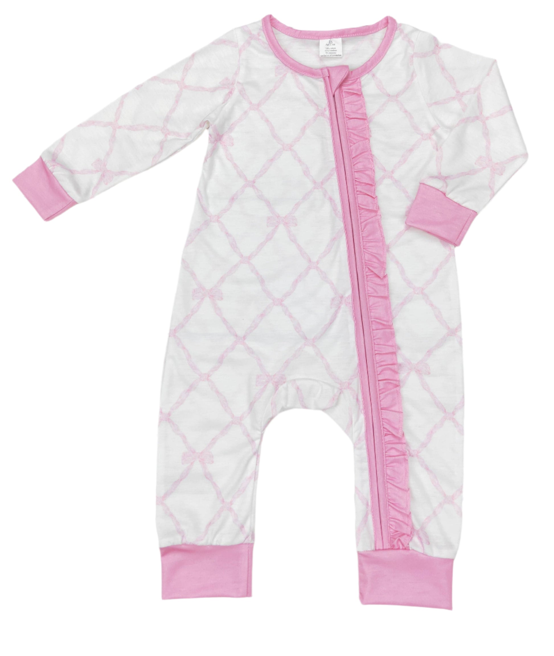 Baby Pink Bow Bamboo Zippy Sleeper Soft, bamboo fabric keeps your baby comfortable while reducing the risk of overheating. Bamboo Material is 45% bamboo 55% cotton and 5% spandex