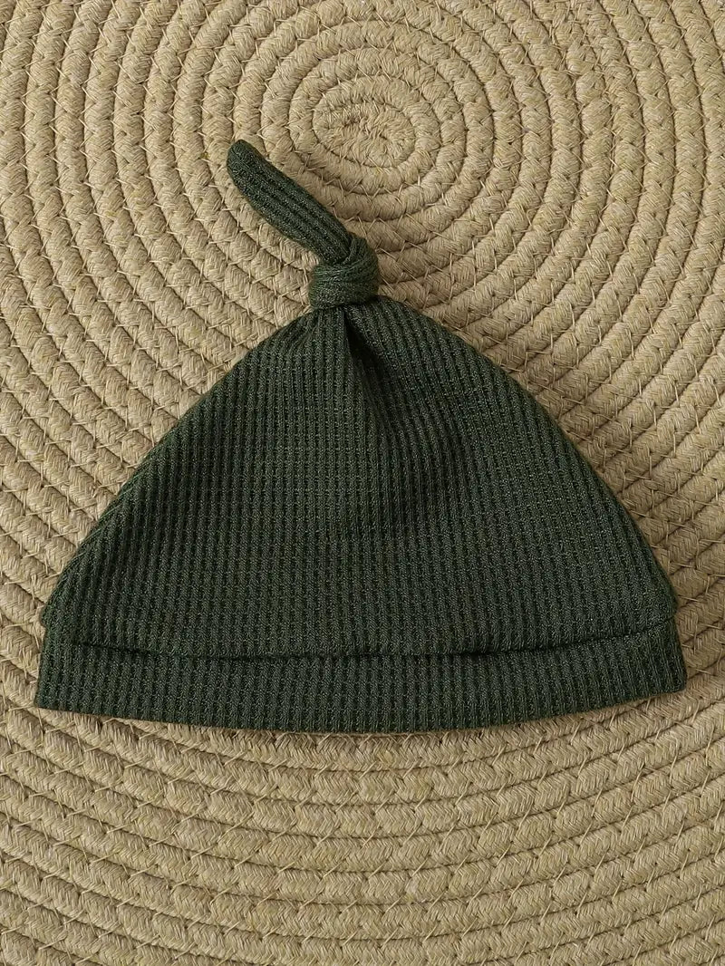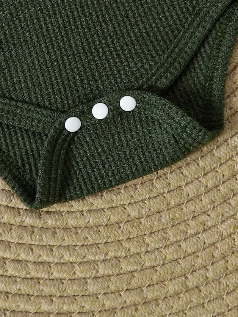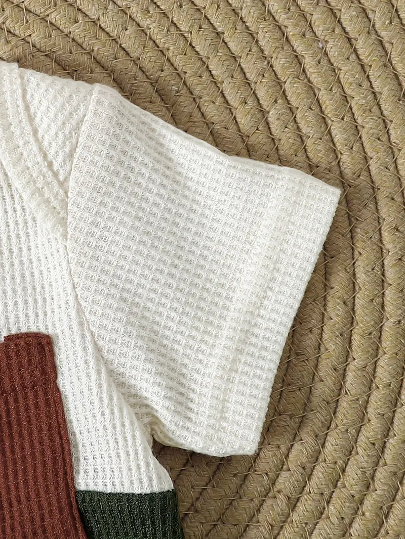 Boys' Casual Spring/Summer Outfit Set - Textured Green & Beige Short Sleeve Onesie with Cartoon Patch, Comfy Stretch Pants & Matching Hat - Machine Washable Polyester Blend, light waffled, Boy Outfits, Perfect for Outdoor
