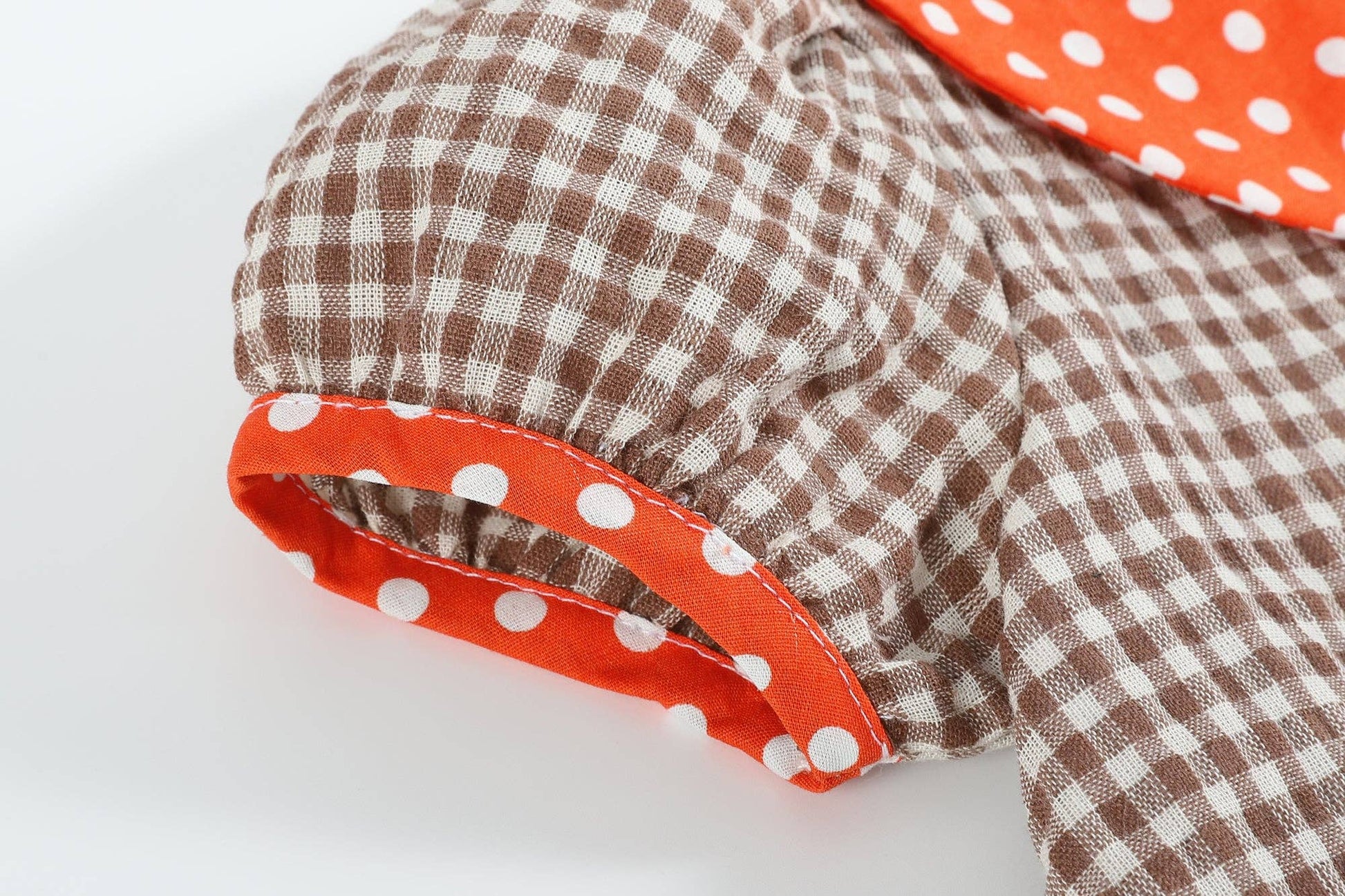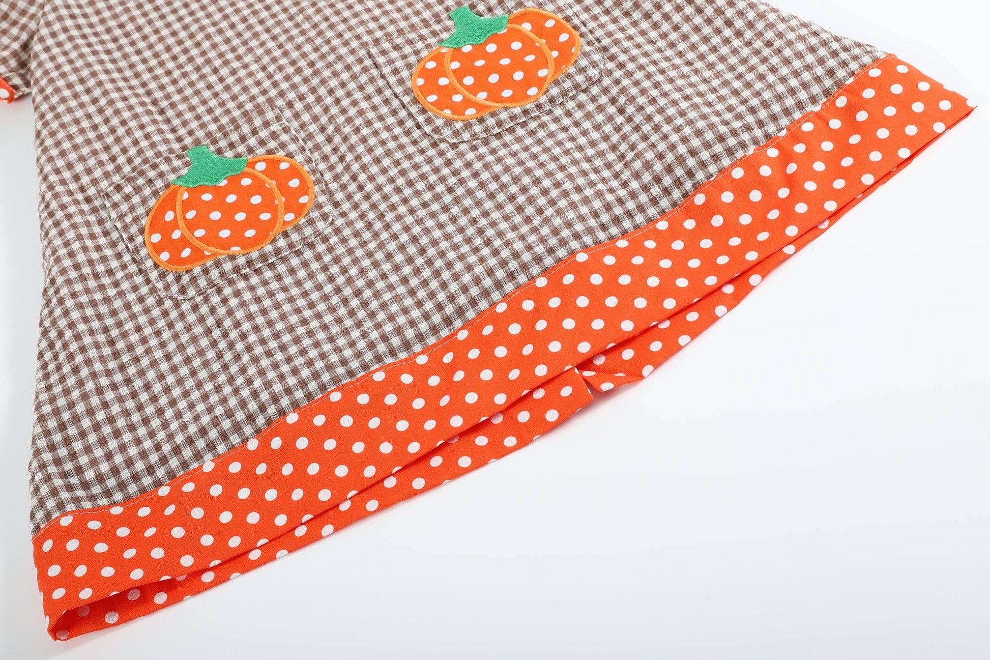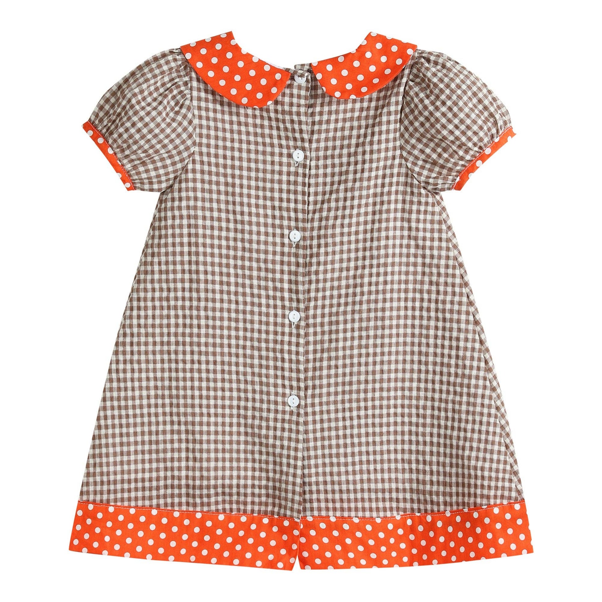 Sweet for Fall! This brown gingham dress by Lil Cactus features pretty pumpkin applique on pockets, a cute polka dot collar, and fun orange trim. Made in 100% soft cotton to ensure your sweet girl is comfortable all day long. A stunning outfit for your cutie and all of her fall adventures. From playing in leaves to walking around the pumpkin patch; no matter the occasion she will be looking picture-perfect!