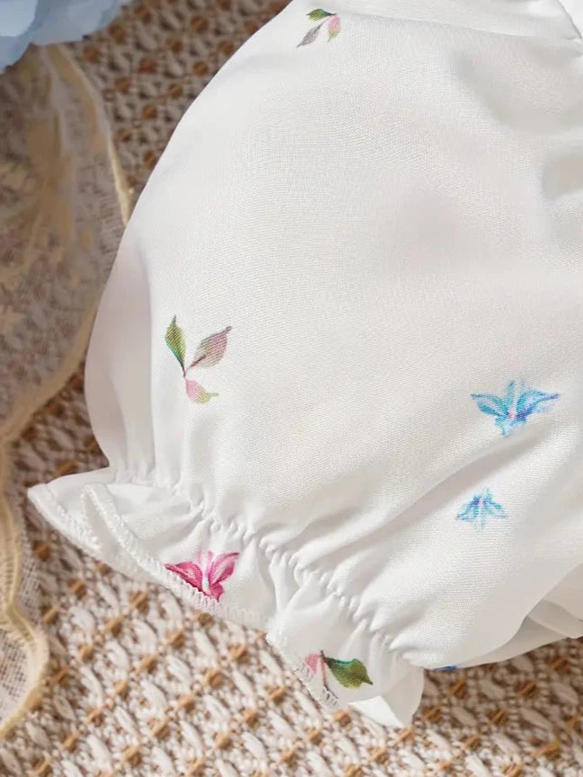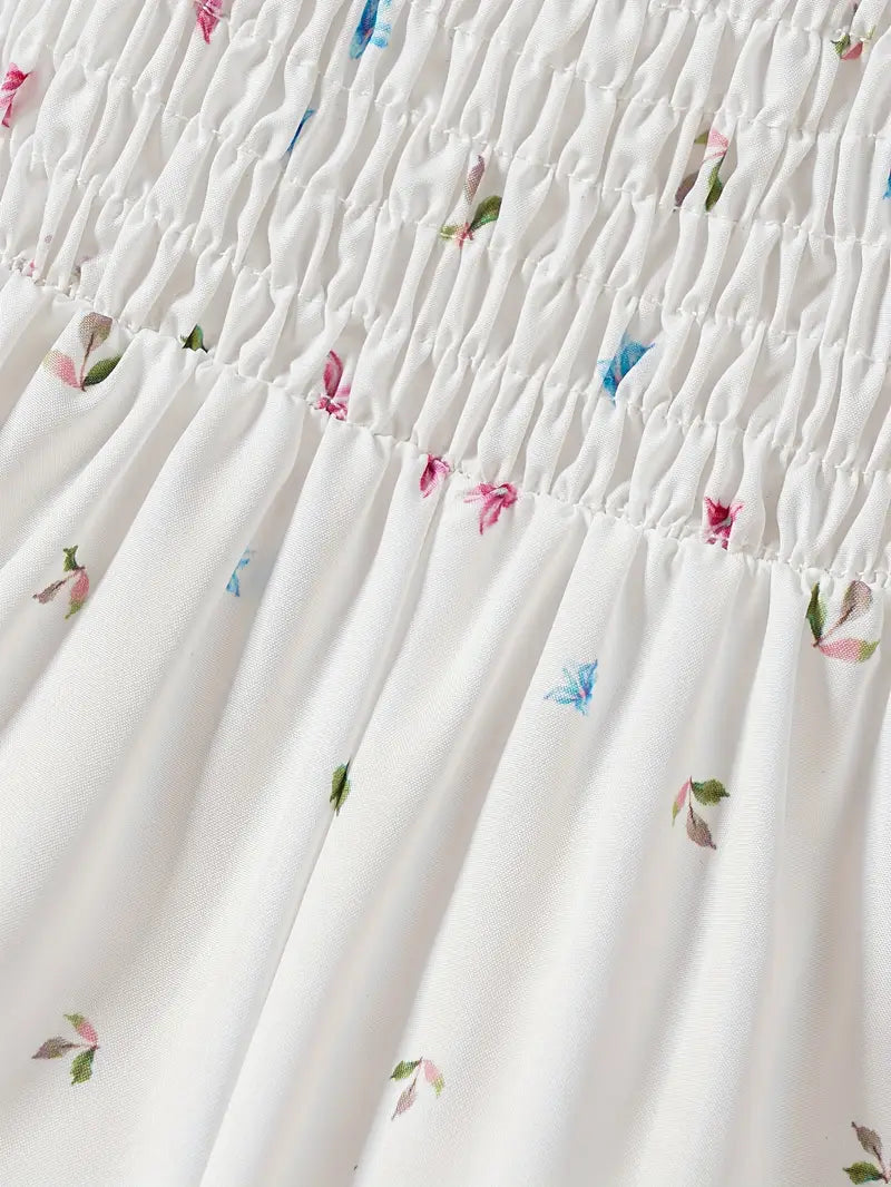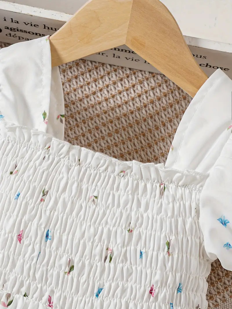Elegant Floral Print Romper for Youngsters - Casual Retro Style with Puff Sleeves, Polyester, Non-Stretch Fabric, Square Neckline, Spring/Summer Wear, Romper for Girls, for Outdoor