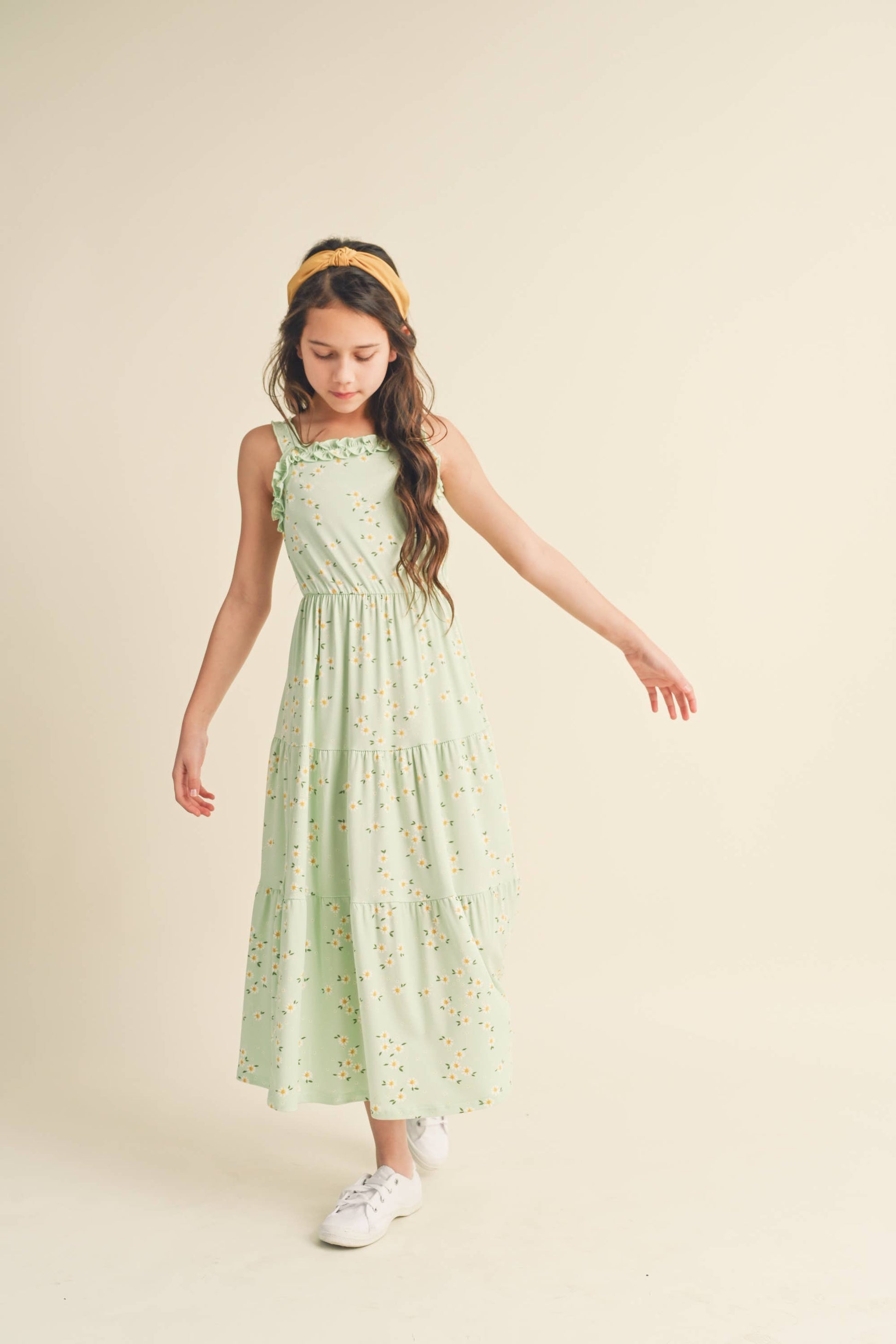 The combination of ruffles and tiered layers gives the dress a youthful and girly aesthetic.